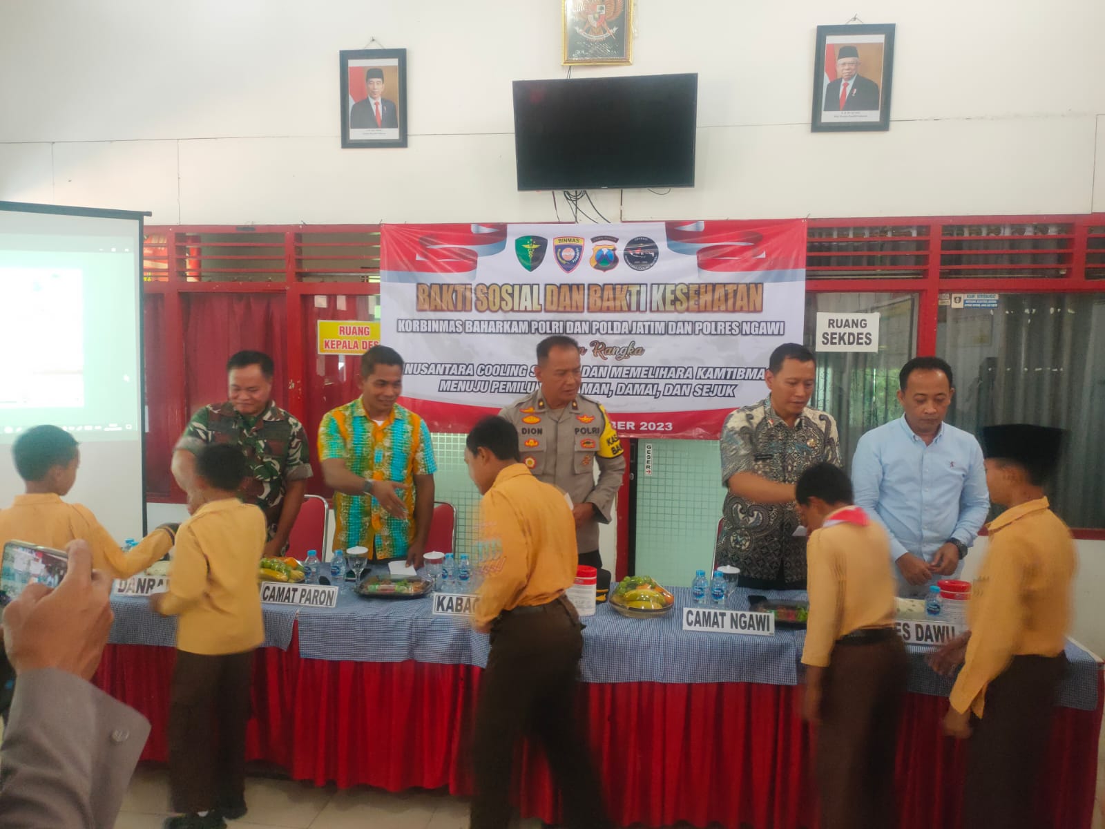 Polres Ngawi Polda Jawa Timur setelah melaksanakan kegiatan zoom meeting dengan Korbinmas Baharkam Polri, menggelar Bakti Sosial dan Bakti Kesehatan kantor desa Dawu Kecamatan Paron, Ngawi pada Jumat (8/12/2023)