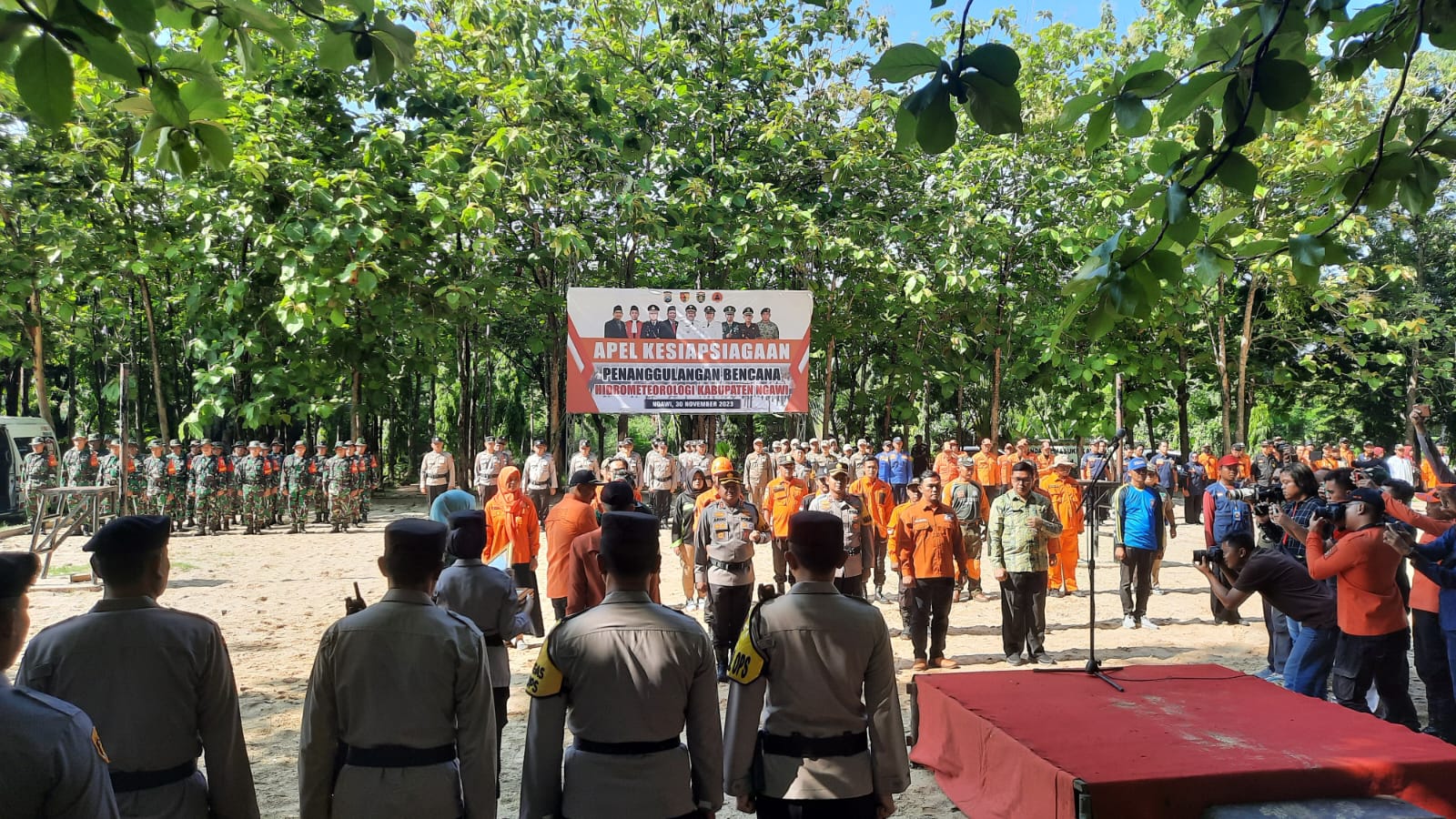 Apel dilaksanakan di lapangan Taman Candi dan diikuti oleh seluruh jajaran Polres Ngawi, Kodim Ngawi, BPBD, Satpol PP, Damkar, Tagana, Perhutani, SAR, serta para relawan.