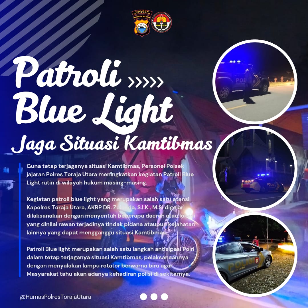 Saat dikonfirmasi, Kapolres Toraja Utara AKBP DR. Zulanda, S.I.K., M.Si melalui Kabag Ops Kompol Gerianto Pabuang, SH menjelaskan bahwa Patroli Blue Light sengaja pihaknya lakukan sebagai upaya Polri harus hadir di tengah Masyarakat dalam melaksanakan tugasnya sebagai pelindung, pengayom dan pelayan Masyarakat serta penegak hukum.