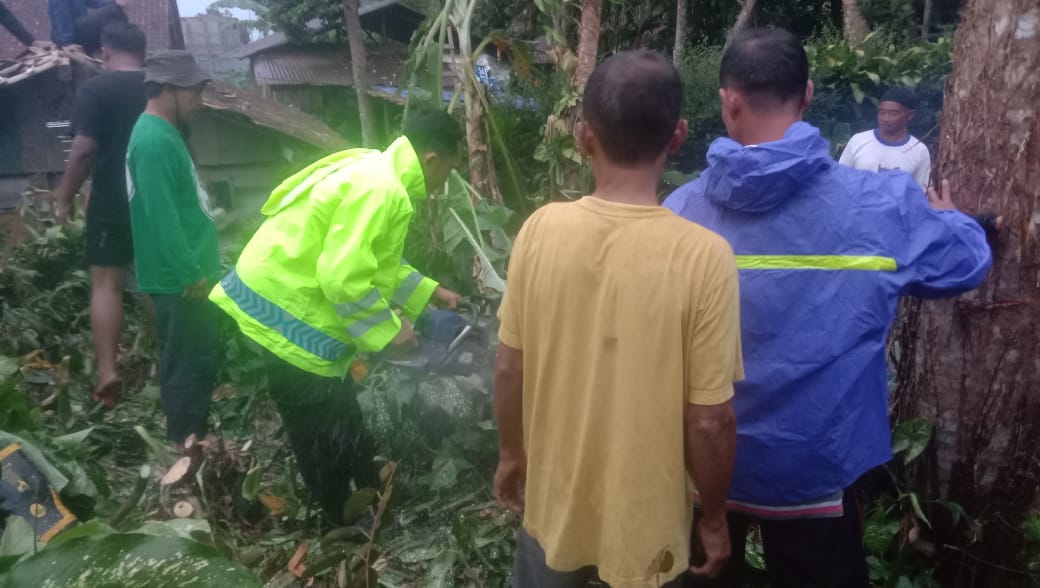 Personel Polri bersama warga setempat kemudian melakukan evakuasi dan pembersihan material pohon tumbang yang menimpa dapur rumah korban.