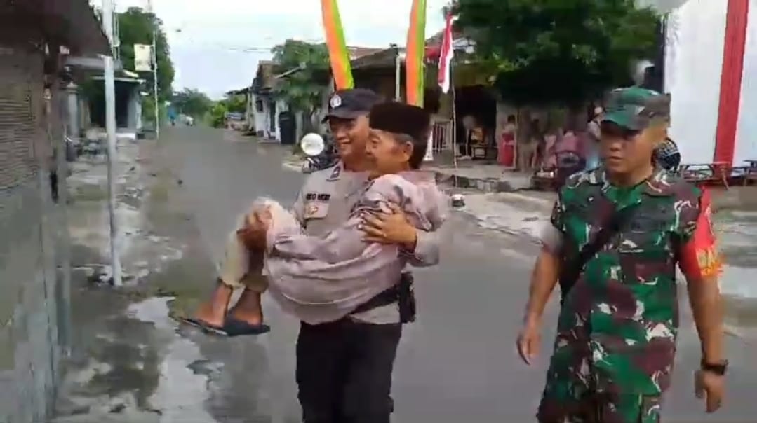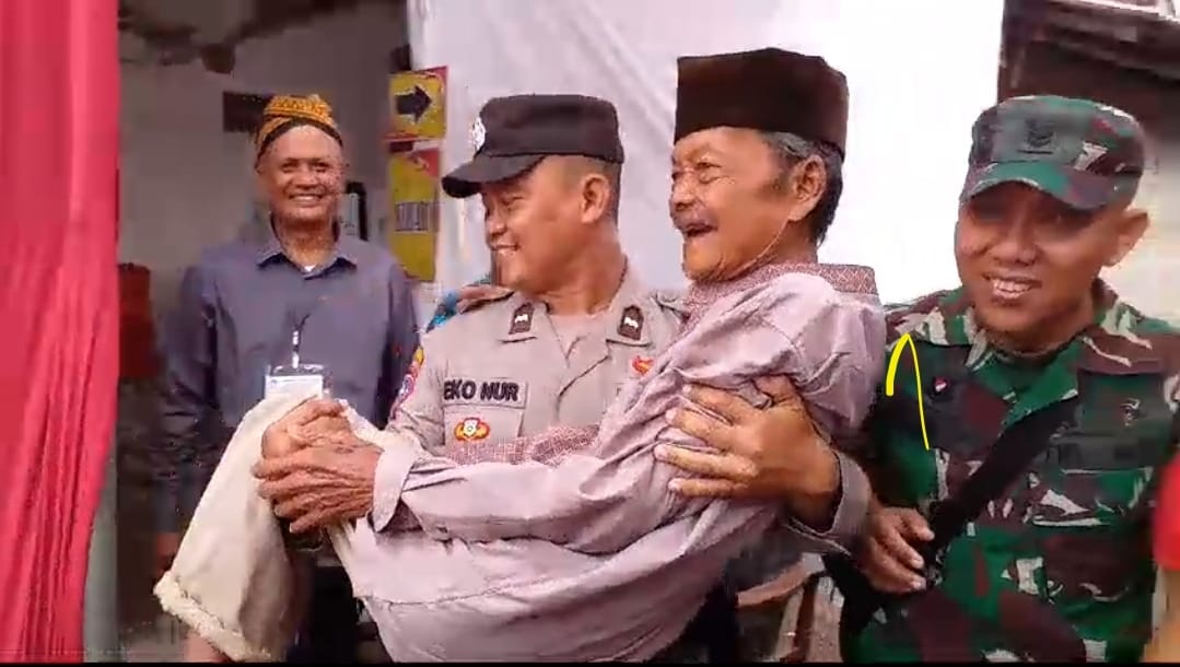 Melihat hal tersebut, Bhabinkamtibmas Ds Puhrubuh Aipda Eko Nur dan Babinsa langsung membantu mengantar warga lansia dengan menggendong ke TPS terdekat.
