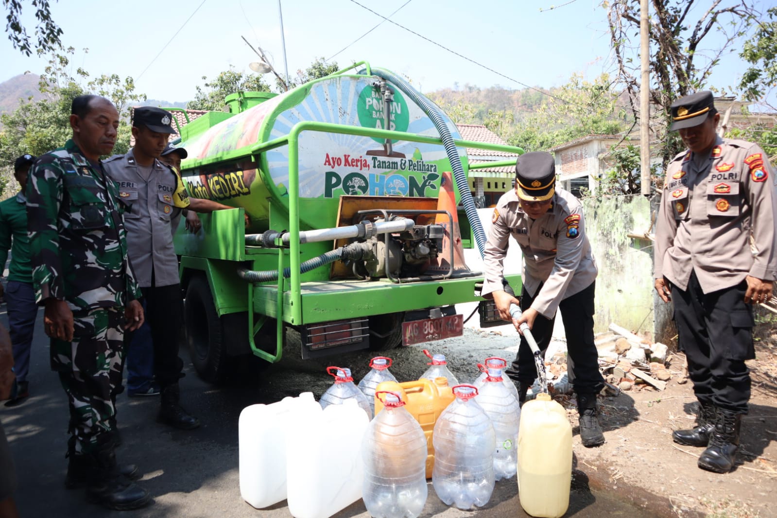 Oleh karena itu, saya didampingi beberapa Pejabat Utama Polres Kediri Kota dan personel Polres Kediri Kota pada pago hari ini, melaksanakan pembagian air bersih berisi 10.000 liter untuk warga dengan menggunakan 2 mobil tangki air.