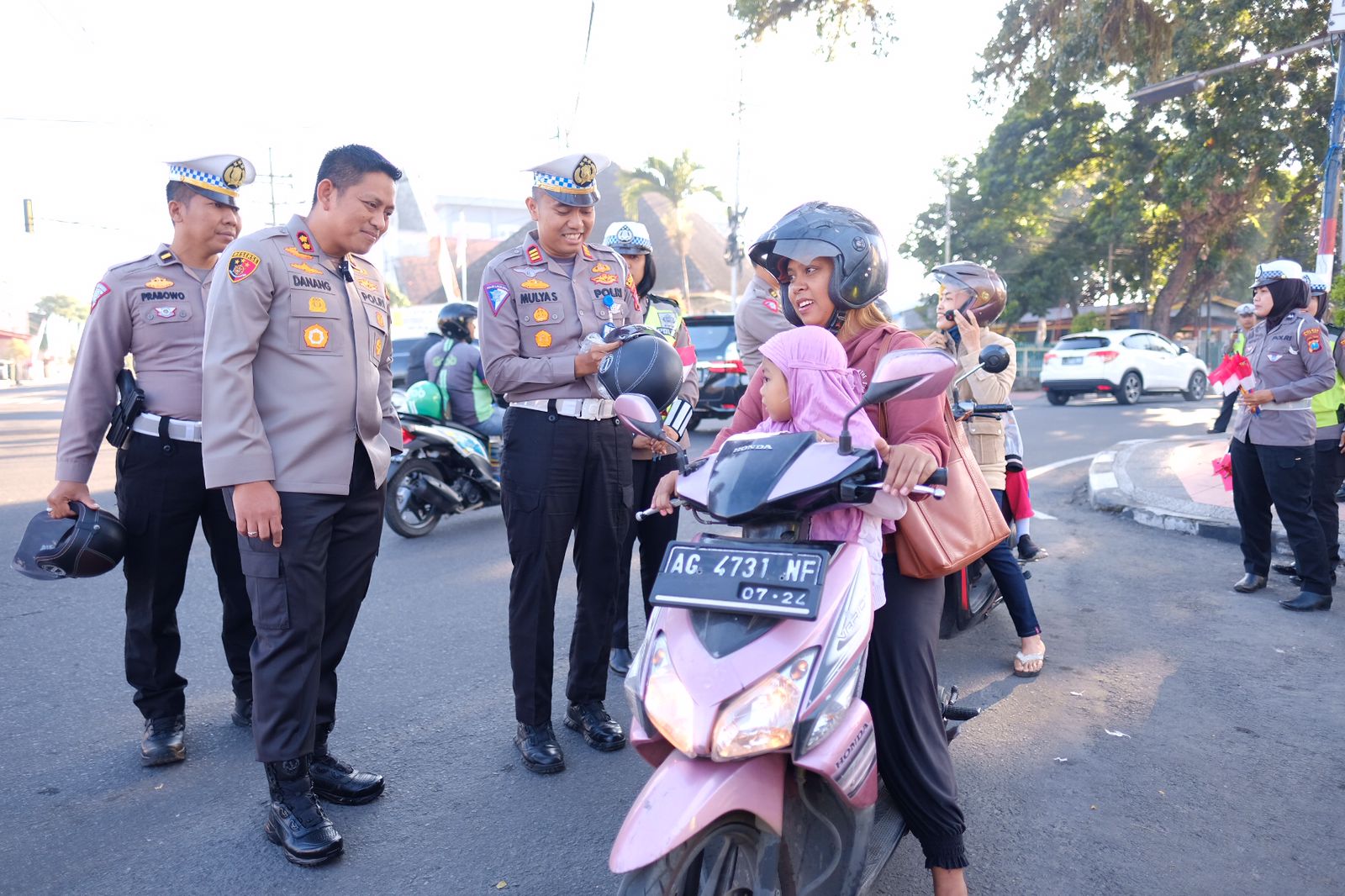 AKBP Danang berharap, dengan adanya kegiatan ini masyarakat bisa semakin paham tentang pentingnya keamanan dalam berlalu lintas, salah satunya bagi pengendara sepeda motor wajib memakai helm. (HUMAS)