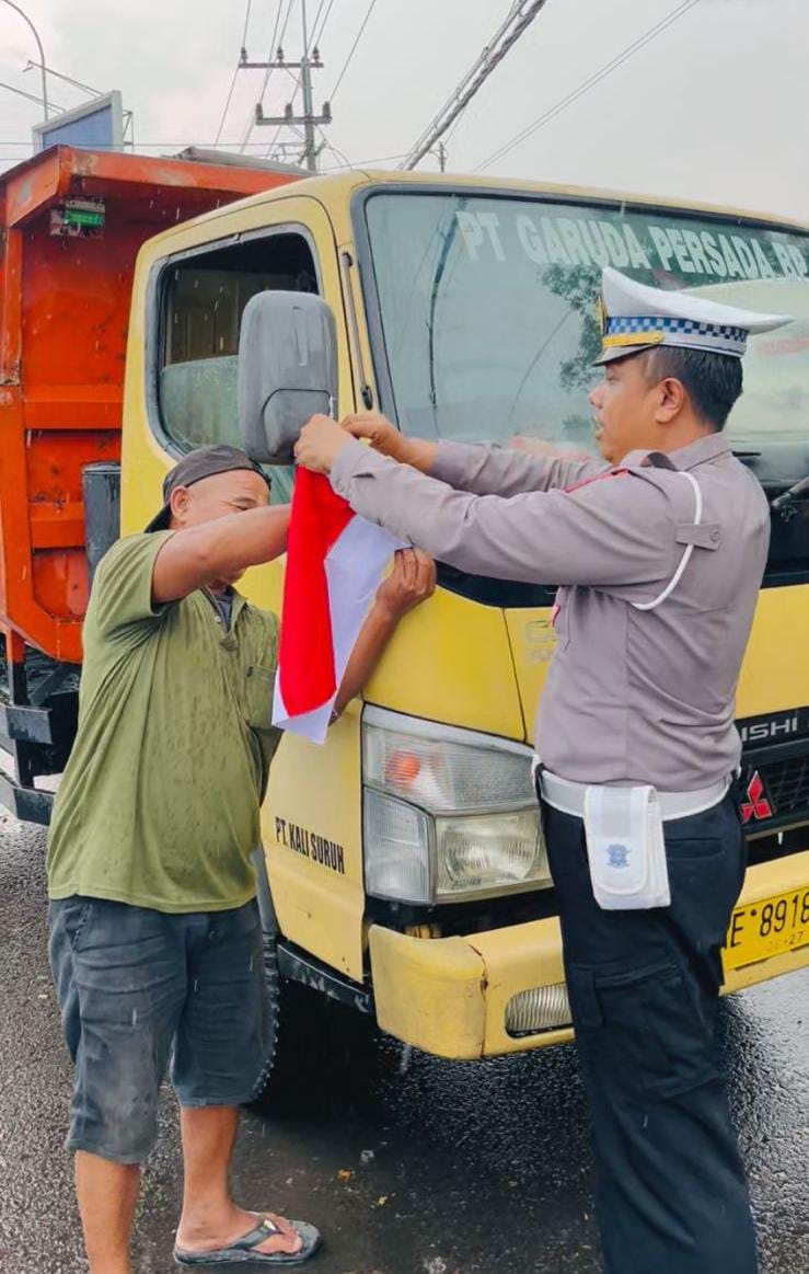 Seperti yang dilakukan oleh anggota Satuan Lalu Lintas Polres Ngawi Polda Jatim, dipimpin Kasat Lantas AKP Yuliana Plantika yang membagikan bendera merah putih dan memasangnya pada kendaraan-kendaraan yang melintas di jalan raya, pada Selasa (5/8/2025).