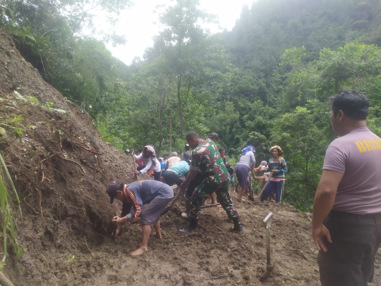 *Sinergitas TNI – Polri bersama Warga Bersihkan Material Longsor dengan Alat Seadanya*