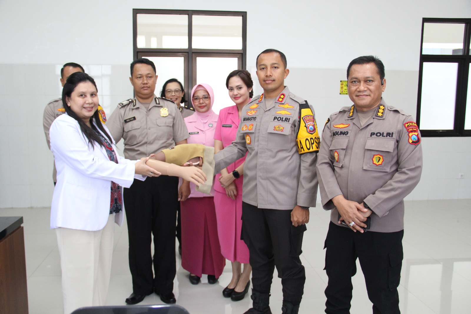AKBP Bramastyo Priaji, S.H., S.I.K., M.Si. memperhatikan pemasangan protesa tangan palsu untuk anggota Polsek Semen Polres Kediri Kota di RS Bhayangkara Kediri
