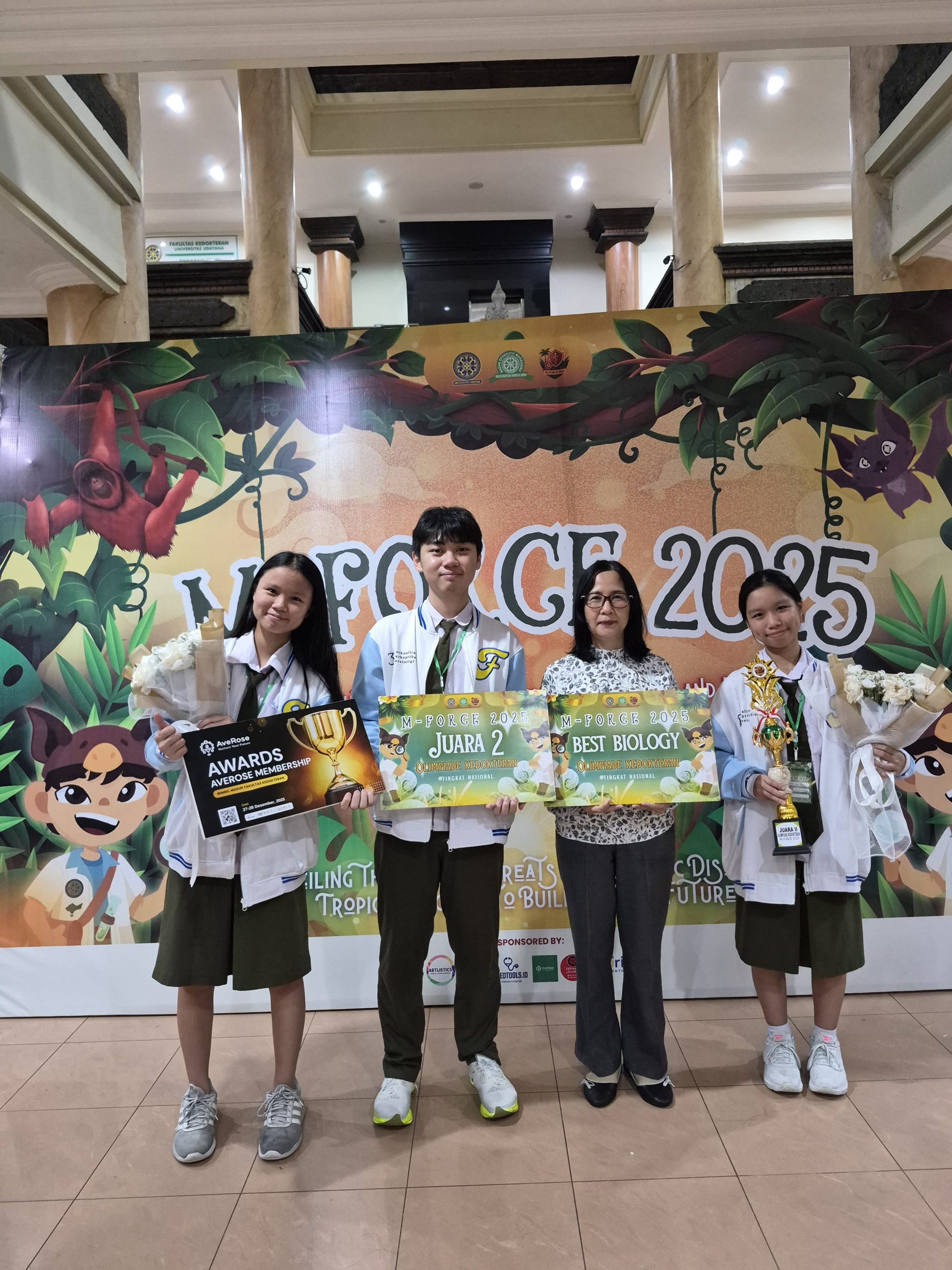 Surabaya, Pilarbangsa.co.id. — Prestasi membanggakan kembali ditorehkan oleh pelajar Indonesia dalam ajang Olimpiade Kedokteran M-FORCE 2025 (Medical Faculty Open Roadshow, Championship, and Exhibition) yang diselenggarakan oleh Universitas Udayana pada 27–28 Desember 2025. Tiga siswa berbakat, yakni Christopher William Kusuma (XII-NSc/04), Kathleen Evelyn Manugan (XII-NSc/13), dan Kathreen Irene Manuganre (XII-NSc/14), berhasil meraih Juara 2 sekaligus menyabet penghargaan Best Biology (Praktikum Terbaik Biologi).