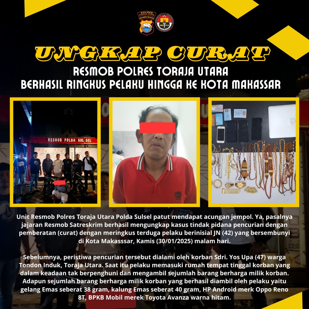 Toraja Utara, Pilarbangsa.co.id. Unit Resmob Polres Toraja Utara Polda Sulsel patut mendapat acungan jempol. Ya, pasalnya jajaran Resmob Satreskrim berhasil mengungkap kasus tindak pidana pencurian dengan pemberatan (curat) dengan meringkus pelaku yang bersembunyi di Kota Makasssar, Kamis (30/01/2025) malam hari.