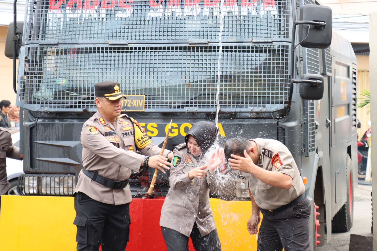 Momen kenaikan pangkat di Lapangan “Ashabur rifky” Polres Gowa dimeriahkan dengan melakukan kegiatan Push-Up dilanjutkan penyiraman air dengan menggunakan mobil Water Canon, aksi ini diharapkan menjadikan kenangan tak terlupakan bagi para personel yang naik pangkat.