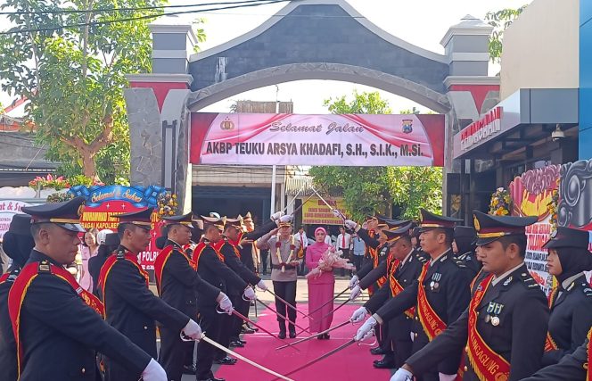 Saat memasuki pintu gerbang, AKBP Muhammad Taat disambut dengan penghormatan pasukan dan dilakukan prosesi pedang pora oleh sejumlah perwira.