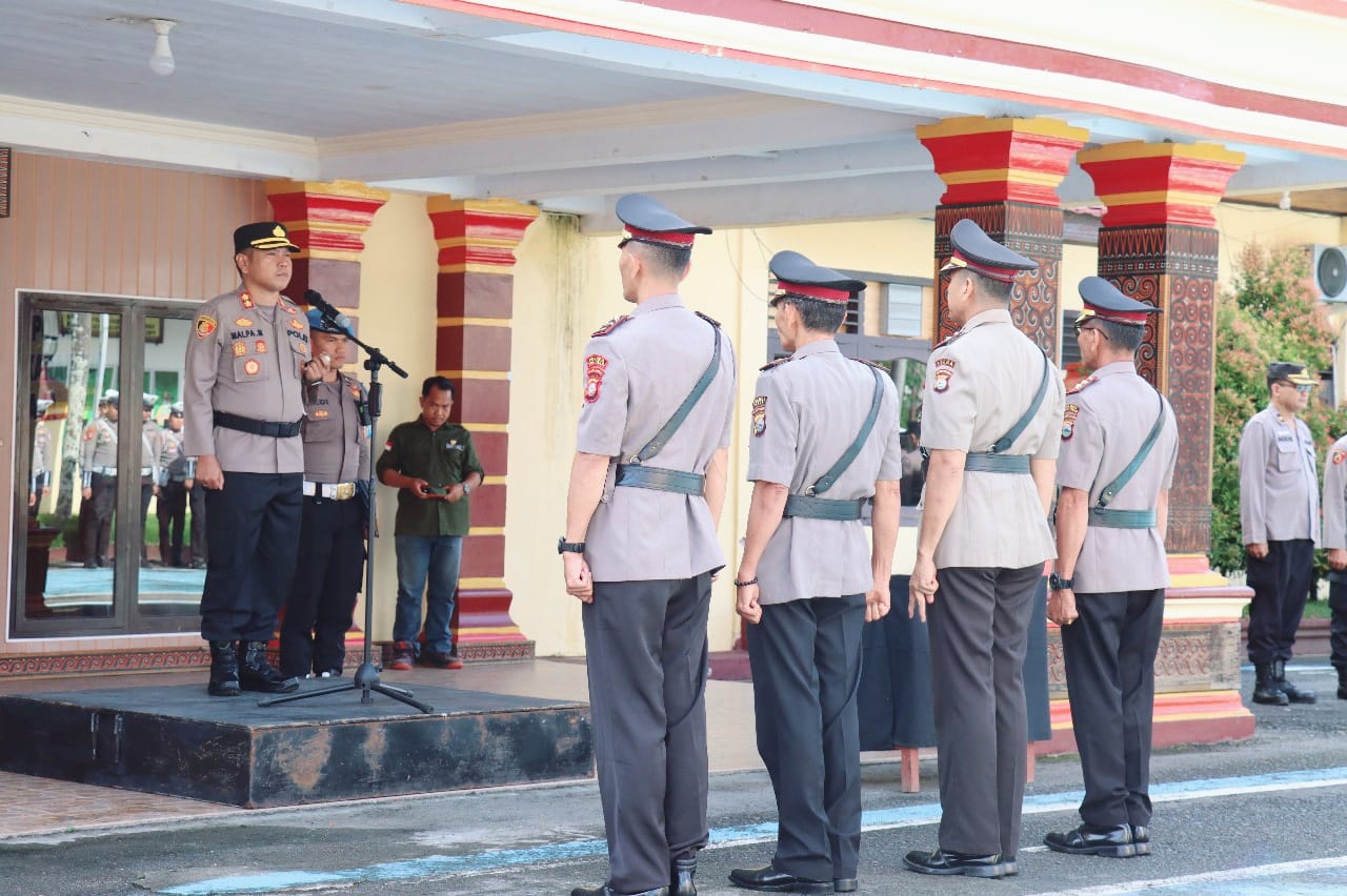 TANA TORAJA – Pilarbangsa.co.id. Kapolres Tana Toraja AKBP Malpa Malacoppo memimpin pelaksanaan upacara serah terima jabatan dan pelantikan jabatan pejabat utama jajaran Polres Tana Toraja di Halaman Mapolres Jalan Bhayangkara No. 1 Makale, Rabu (19/3/25) pagi tadi.