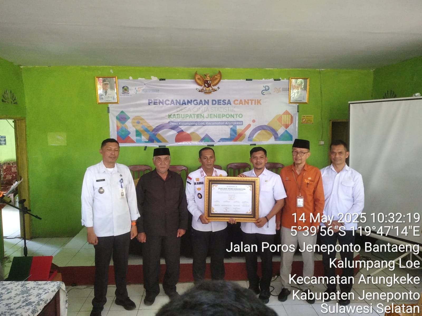 JENEPONTO – Pilarbangsa.co.id. Wakil Bupati Jeneponto, Islam Iskandar, secara resmi mencanangkan Desa Kalumpangloe, Kecamatan Arungkeke, sebagai Desa Cinta Statistik (Desa Cantik) pada hari Rabu, 14 Mei 2025. Acara yang berlangsung di Aula Kantor Desa Kalumpangloe ini menandai komitmen pemerintah daerah dalam meningkatkan literasi dan pemanfaatan data statistik di tingkat desa.