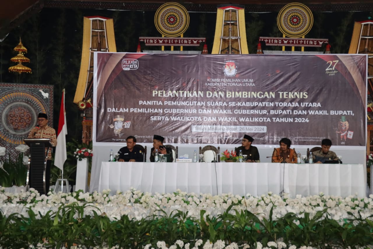 Kegiatan Pelantikan dan Bimtek yang digelar oleh KPUD Toraja Utara tersebut berlangsung di Toraja Missiliana Hotel Kecamatan Kesu Kabupaten Toraja Utara, Minggu (26/05/2024).